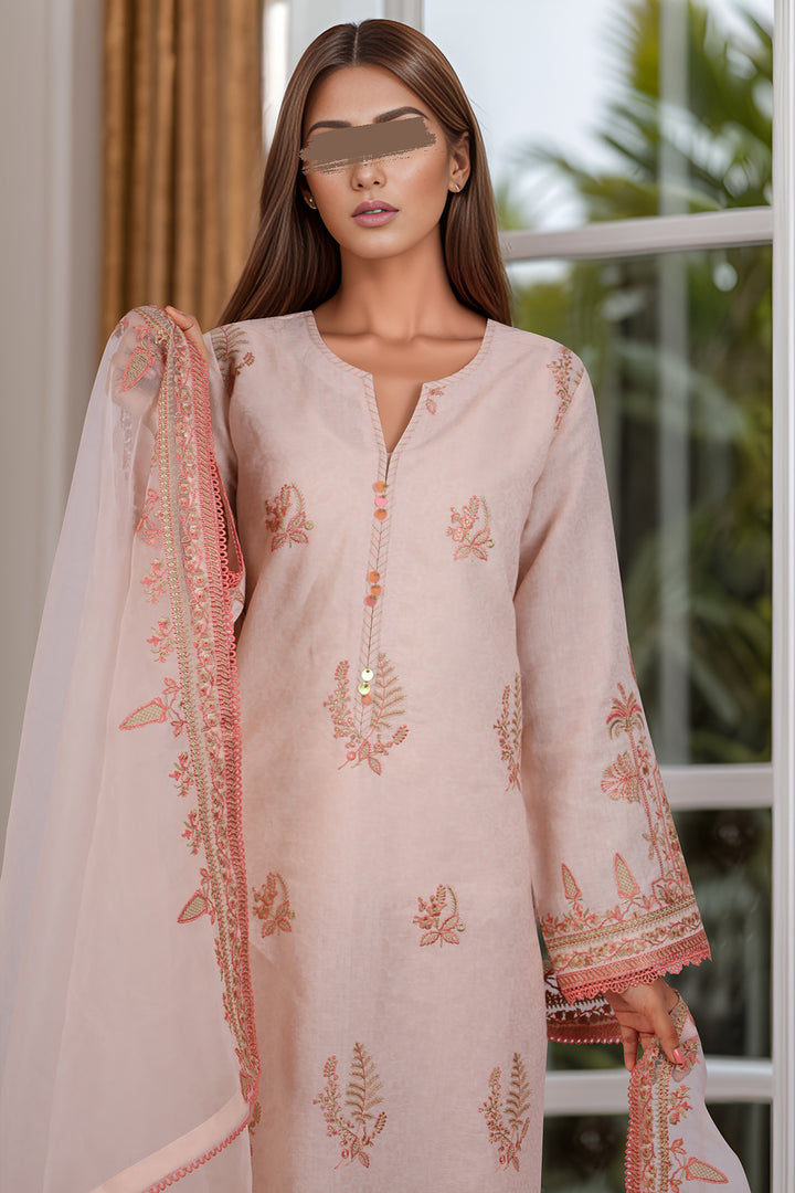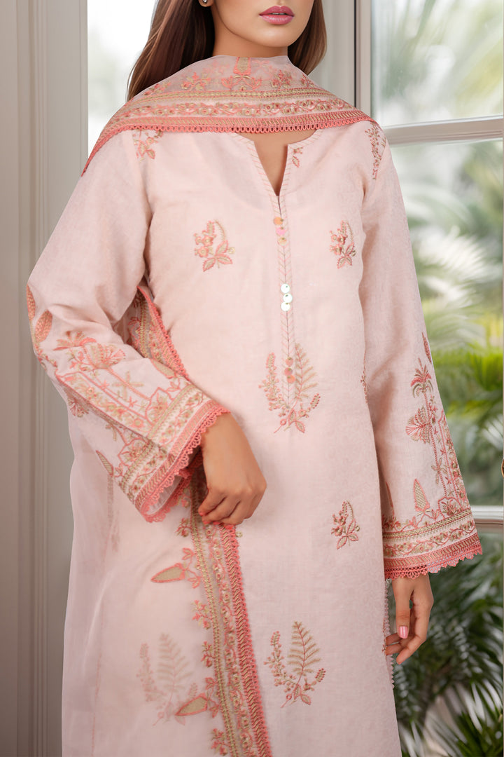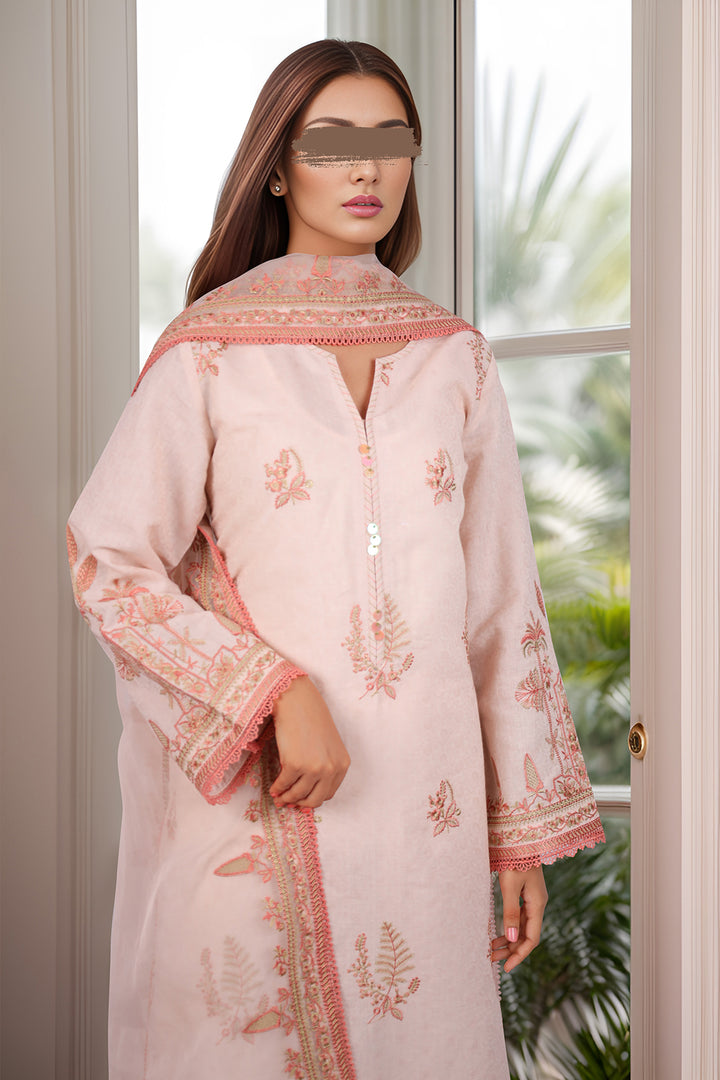 Add sophistication to your wardrobe with Saya.pk's unstitched embroidered self-jacquard 3-piece suit. This premium set features an intricately embroidered self-jacquard shirt, plain trousers, and a coordinating embroidered dupatta, perfect for semi-formal and festive occasions. Elevate your style effortlessly.