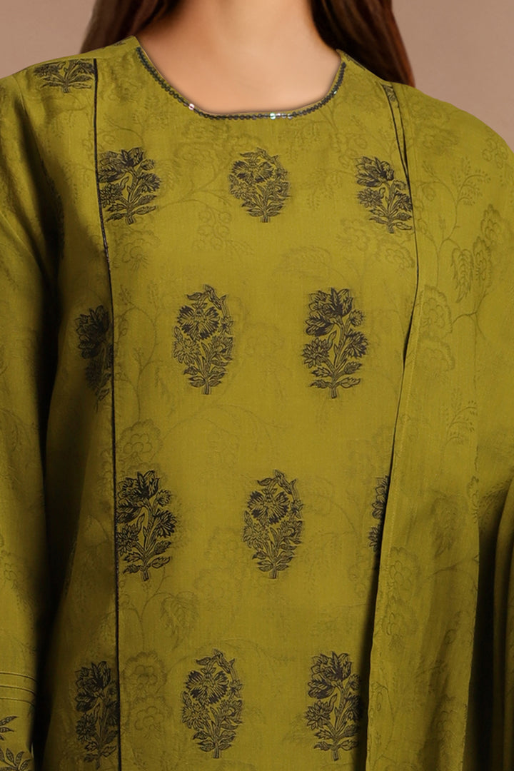 Saya's Unstitched Jacquard Cotton 3-Piece Suit in Olive Green offers a perfect blend of elegance and comfort, suitable for both casual and semi-formal occasions. Crafted from premium cotton jacquard fabric, this ensemble provides breathable comfort and a sophisticated texture, allowing you to tailor it to your unique style.