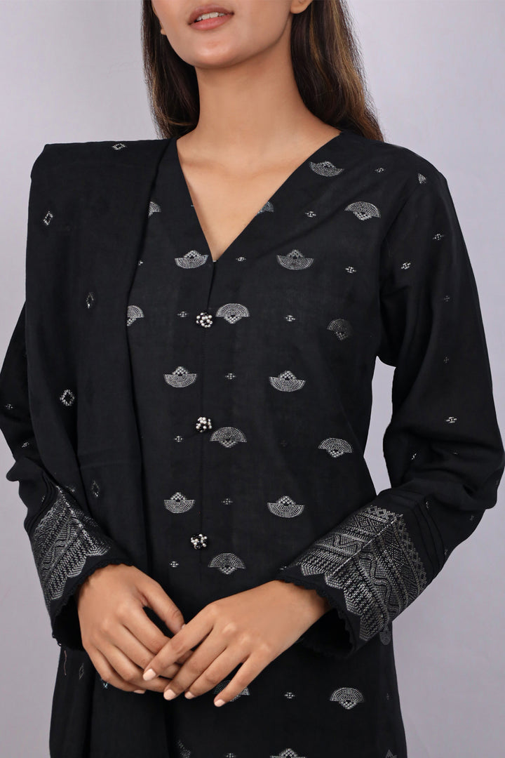 Experience Refined Elegance With This SAYA Unstitched Jacquard Cotton 3-Piece Set, Featuring Premium Textured Fabric, A Graceful Jacquard Dupatta, And A Soft Dyed Cambric Trouser, Perfect For Chic Daily Wear And Semi-Formal Styling.