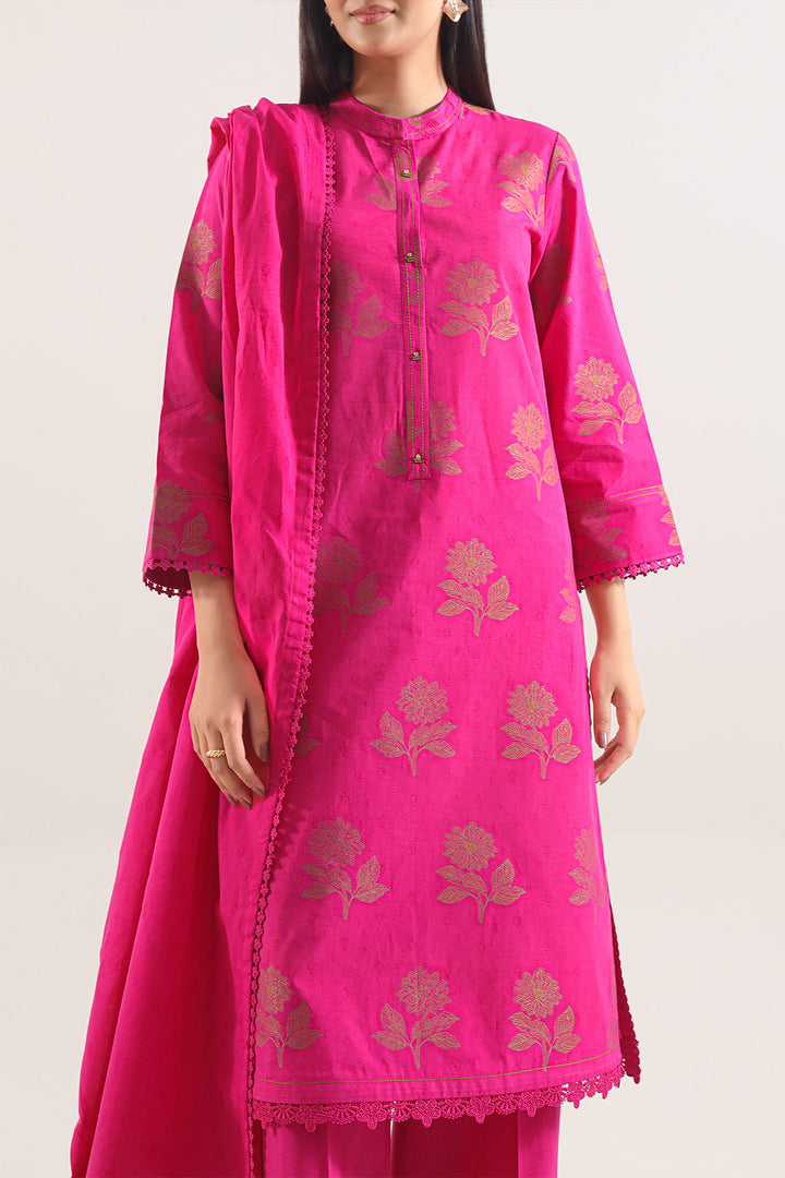 Elevate Your Wardrobe With The Unstitched Jacquard Cotton 3-Piece Set From SAYA, Expertly Crafted With Premium Cotton Jacquard Fabric That Offers A Subtle Self-Textured Weave For Refined Sophistication. The Set Includes A Beautifully Woven Shirt Panel, A Coordinated Jacquard Dupatta, And A Dyed Cambric Trouser Piece, Allowing Tailoring Freedom And Versatile Styling. Perfect For Semi-Formal Gatherings, Elegant Daywear, Or Smart Casual Occasions, It Seamlessly Balances Comfort, Quality, And Timeless Fashion.