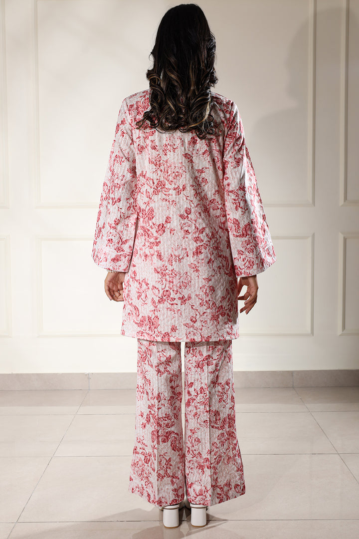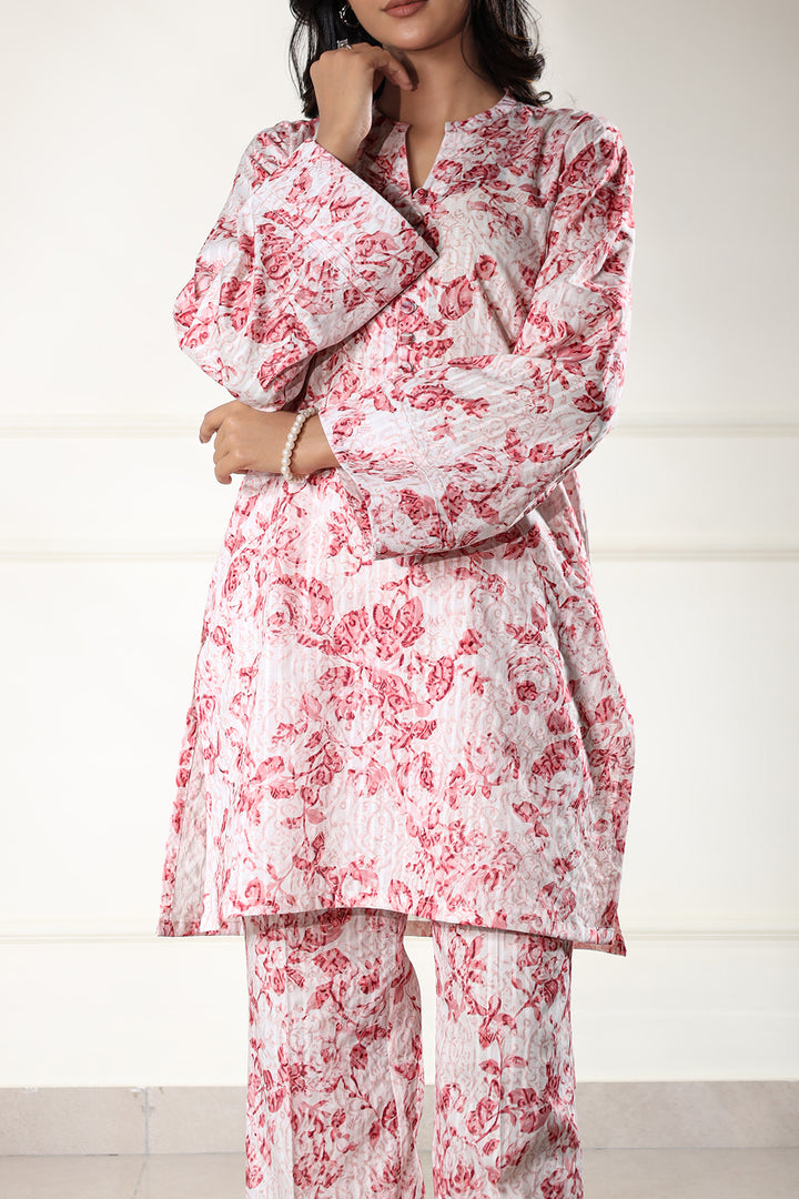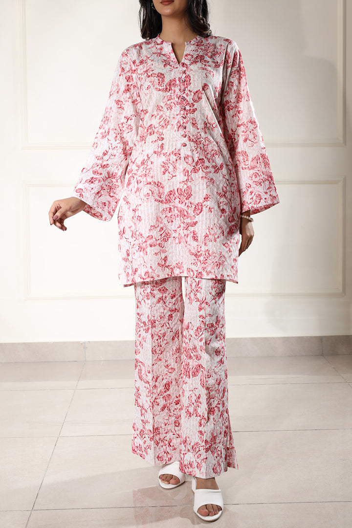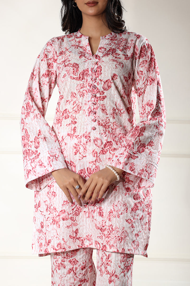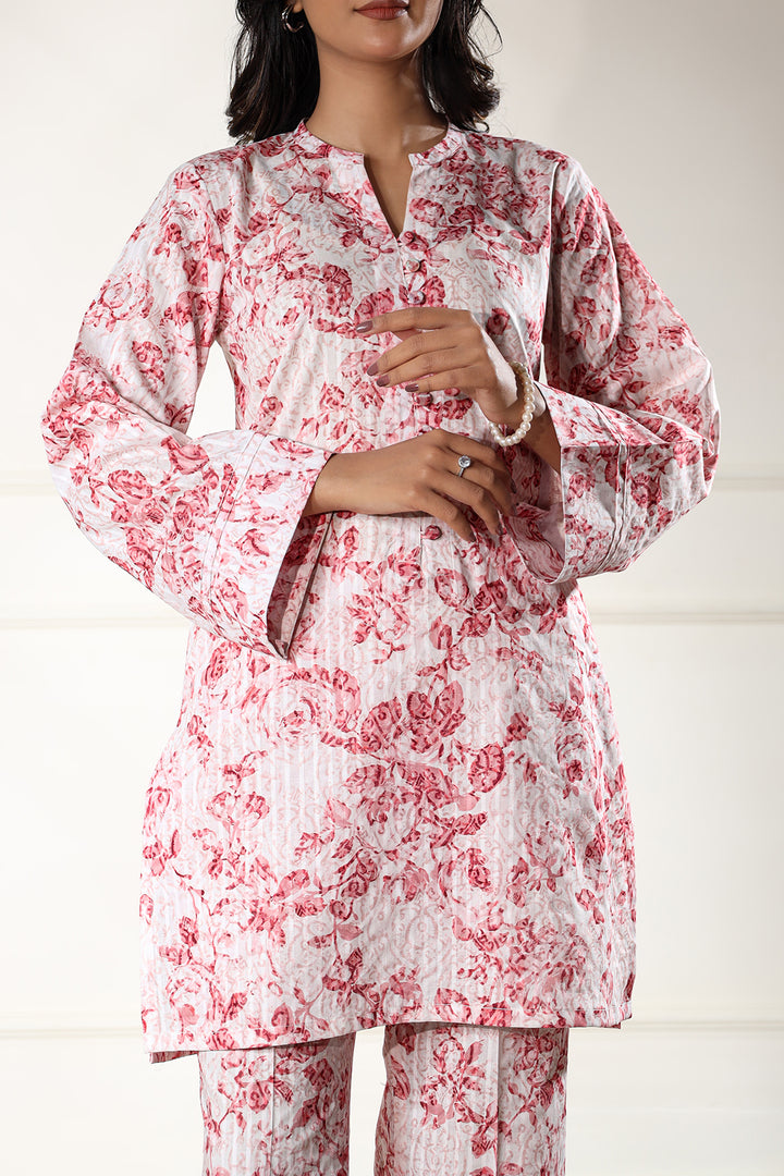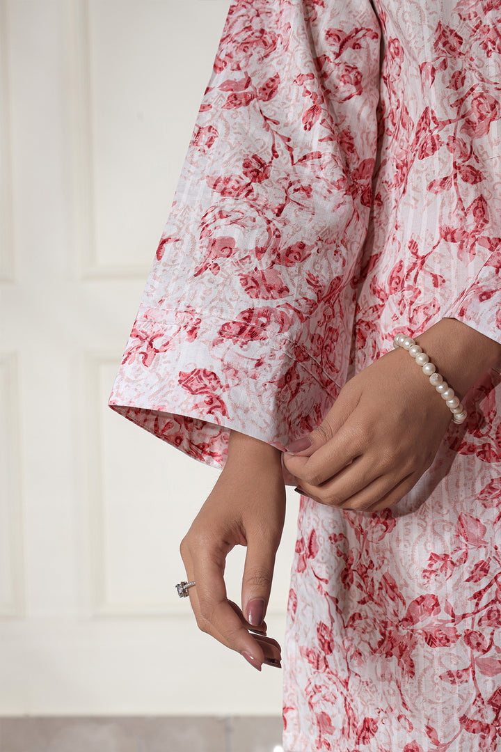Elevate your summer wardrobe with Saya's Unstitched Printed Lawn 2-Piece suit in a refreshing pink hue. Crafted from premium self-striped lawn fabric, this ensemble ensures breathability and comfort during Pakistan's warm seasons.