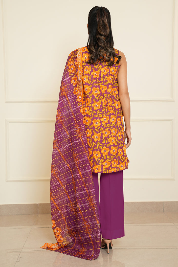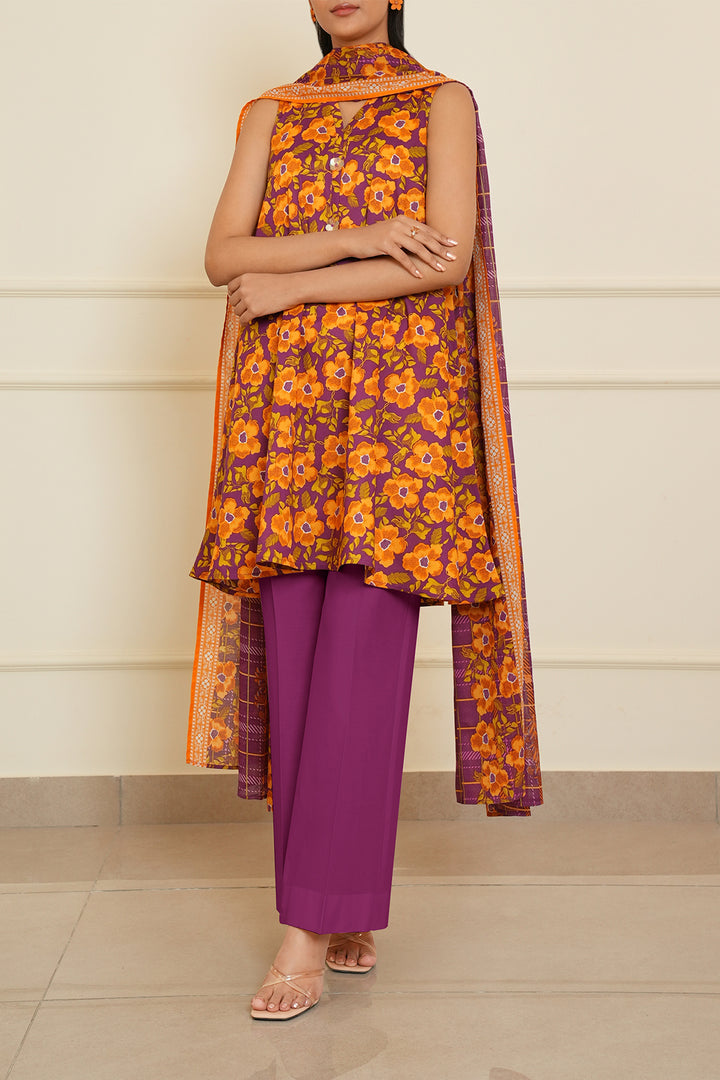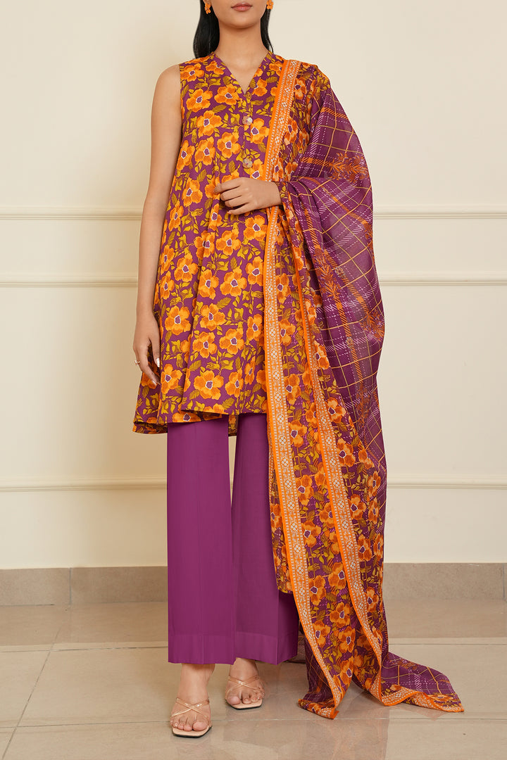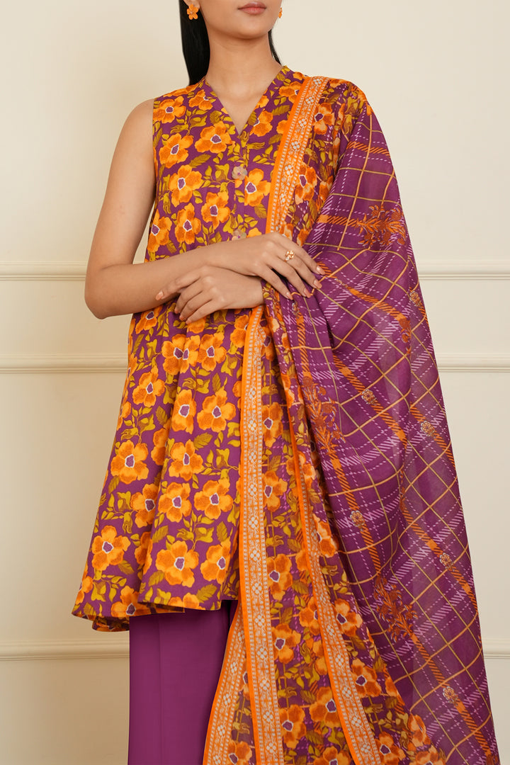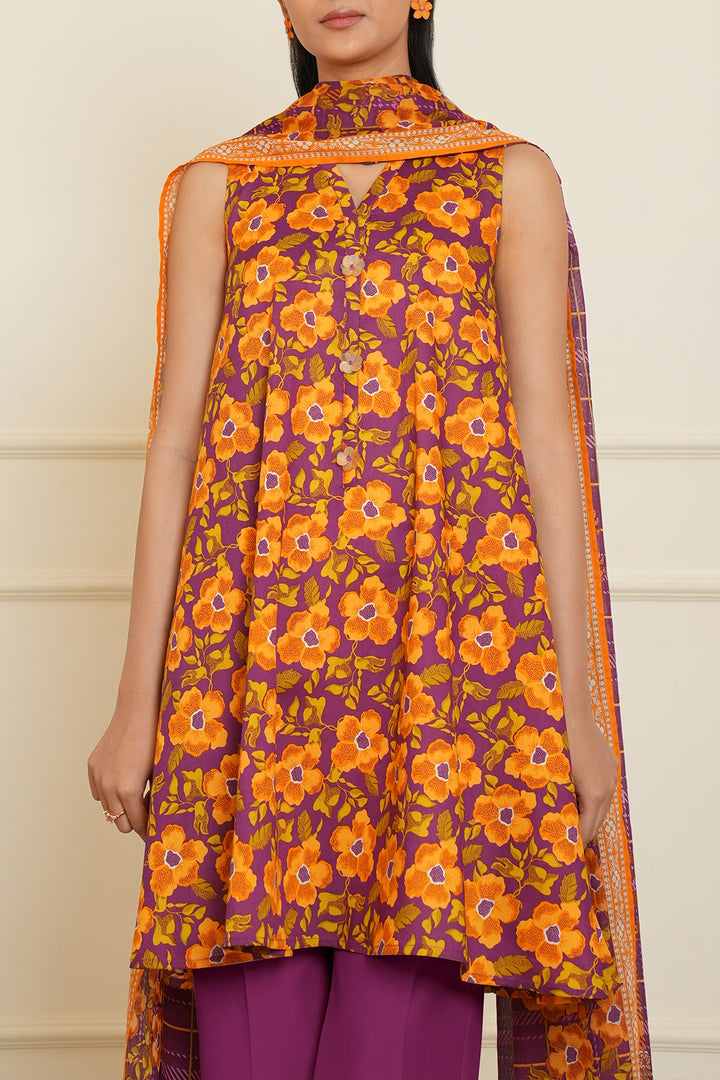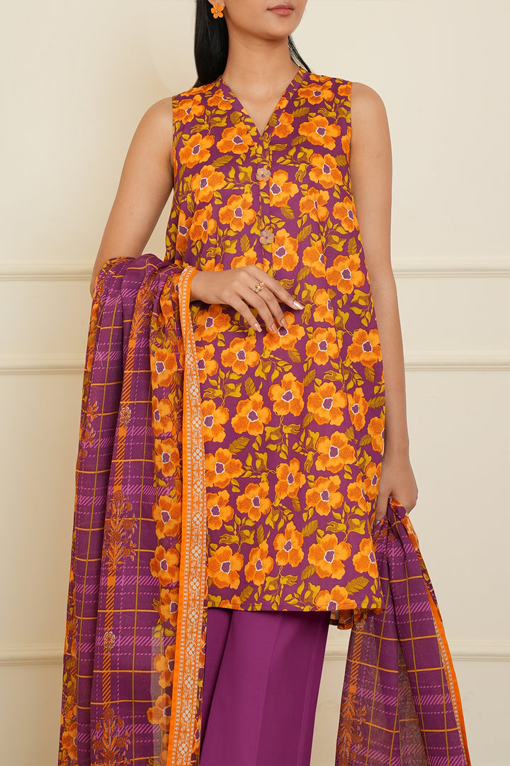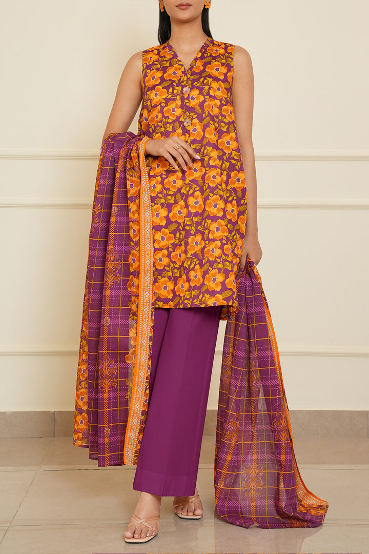 Introducing Saya's Unstitched Printed Lawn 3-Piece ensemble, a perfect blend of elegance and comfort. This set features a plum-colored premium lawn shirt adorned with intricate prints, complemented by a matching printed lawn dupatta and dyed cambric trousers. The unstitched design allows for personalized tailoring, making it suitable for both casual outings and semi-formal events.